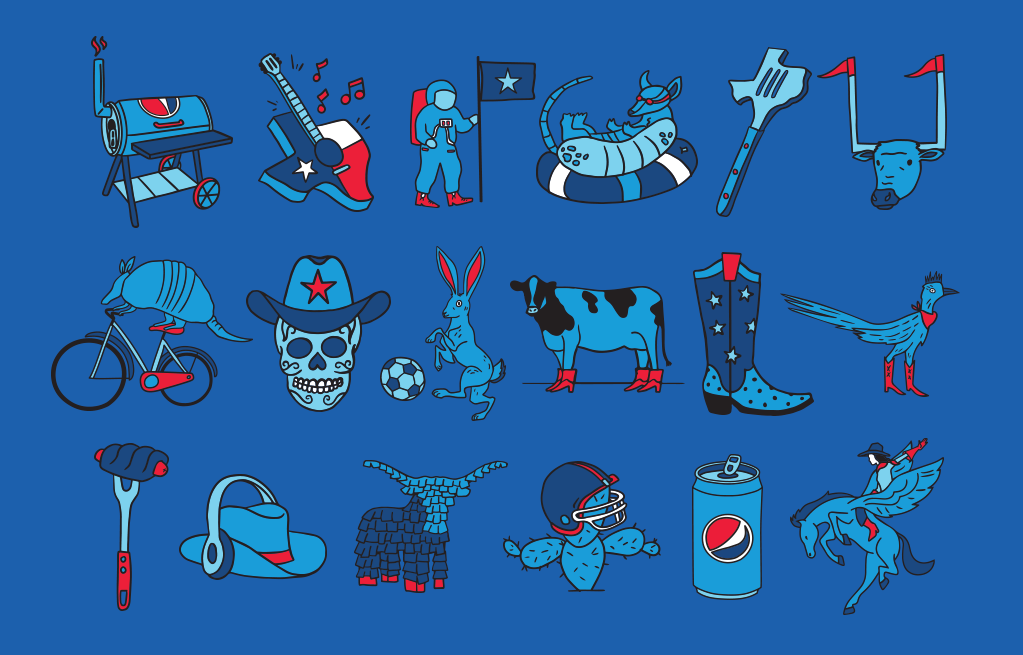 As a challenger brand Pepsi wanted to find an authentic way to tap into Lone Star culture across the great state of Texas. As native Texans my team played off of the unique paradoxes on display in each of our four major cities, proving that Texan’s aren’t the cliches people might make them out to be. This was brought to life in retail and restaurant partners locations through the unofficial uniform of the state — the t-shirt. We created point-of-sale signage, digital elements, a microsite, and a whole slew of icons and illustrations that were used throughout the campaign.